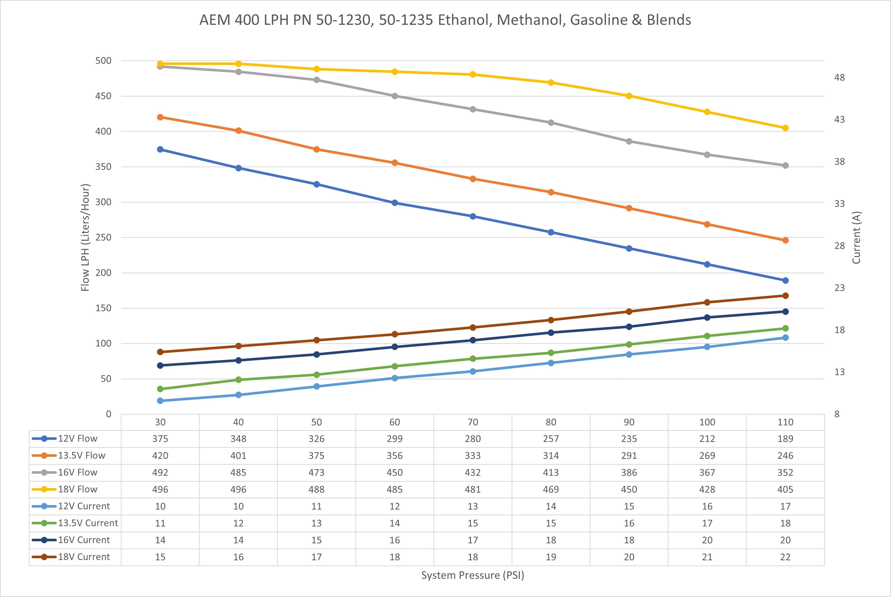 AEM's 400LPH high flow fuel pumps were designed with high performance naturally aspirated and forced induction EFI vehicles in mind! They deliver the same high flow and reliable performance that AEM has become known for at very competitive price. Each pump is individually flow tested and guaranteed to flow 400+ LPH (106 GPH) at 40 PSI (13.5V), which on gasoline will support 1000+ horsepower!* The pumps also maintain their high flowrate even as system pressure increases flowing 330+ LPH at 70 PSI (13.5V) which will support approx. 870 HP* on gasoline! Please see the flow curves and current draw vs. fuel pressure graphs on the specs tab for more information. With their compact 39mm body (same size as Walbro 255), low amperage draw, 11mm inlets and 9mm barbed outlet's these fuel pumps were designed to replace the OEM fuel pump in many applications. The 50-1230 features a double barbed outlet that is ideal for 3/8-inch ID hose where the 50-1235 features a smooth barbed outlet that is compatible with 5/16-inch ID hose. Each pump includes a wiring harness, pre filter, end cap and rubber buffer sleeve.Note: Your vehicle's factory fuel pump wiring may not be adequate to handle the current draw of AEM's High Flow Fuel Pumps. Please refer to the Electrical Requirements section in the instructions document for proper wiring.Note: These pumps do not include integrated check valves.