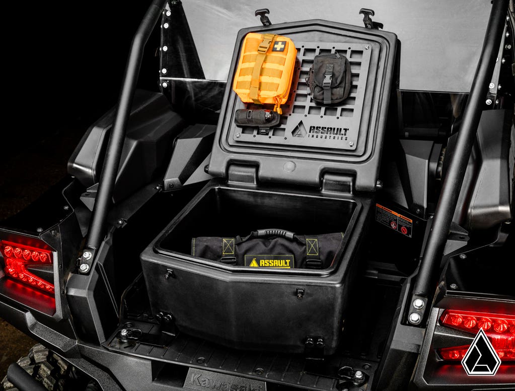The temperatures are blazing hot. Thank goodness you’re equipped with Assault Industries' Cooler and Cargo Box for the Kawasaki Teryx KRX 1000. You loaded it up with ice and drinks before you even hit the dunes and now you’re the most popular guy on the sand! When you’re not using it to keep drinks cool, you can use it as a secure cargo box to protect your gear from dirt and sand. It mounts securely with steel brackets, so it won’t slide out of your machine’s bed. And the shiny aluminum Assault logo on the lid will really turn heads.