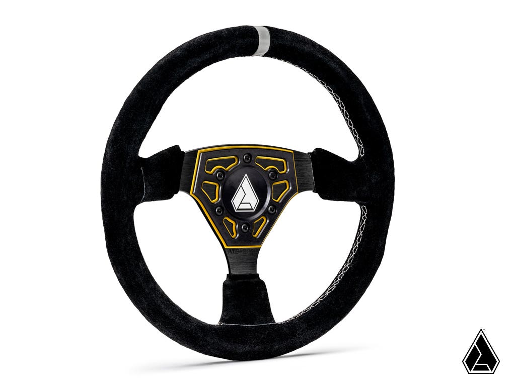 Sleek Battle DesignYou need a steering wheel that supports your riding style and prepares you for battle. This universal suede steering wheel is finished in black suede and has the Assault logo stitched in gray. And for a more sleek design, you can choose from five different colored base plates to accent the middle top plate.
