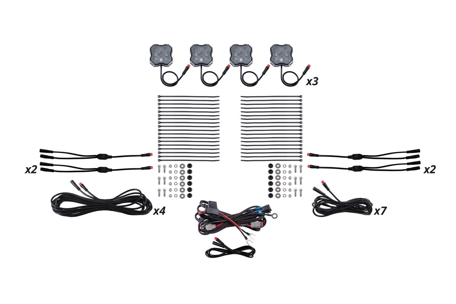 Earn $15.15 in King Kong Rewards with this purchase. Included in the box: Twelve (12) Stage Series RGBW Rock Lights Twelve (12) Rock Light Hardware Kits One (1) Rock Light RGBW Wiring Harness One (1) 1M Extension Seven (7) 3M Extensions Four (4) 5M Extensions Thirty-Six (36) Zip Ties Installation guide