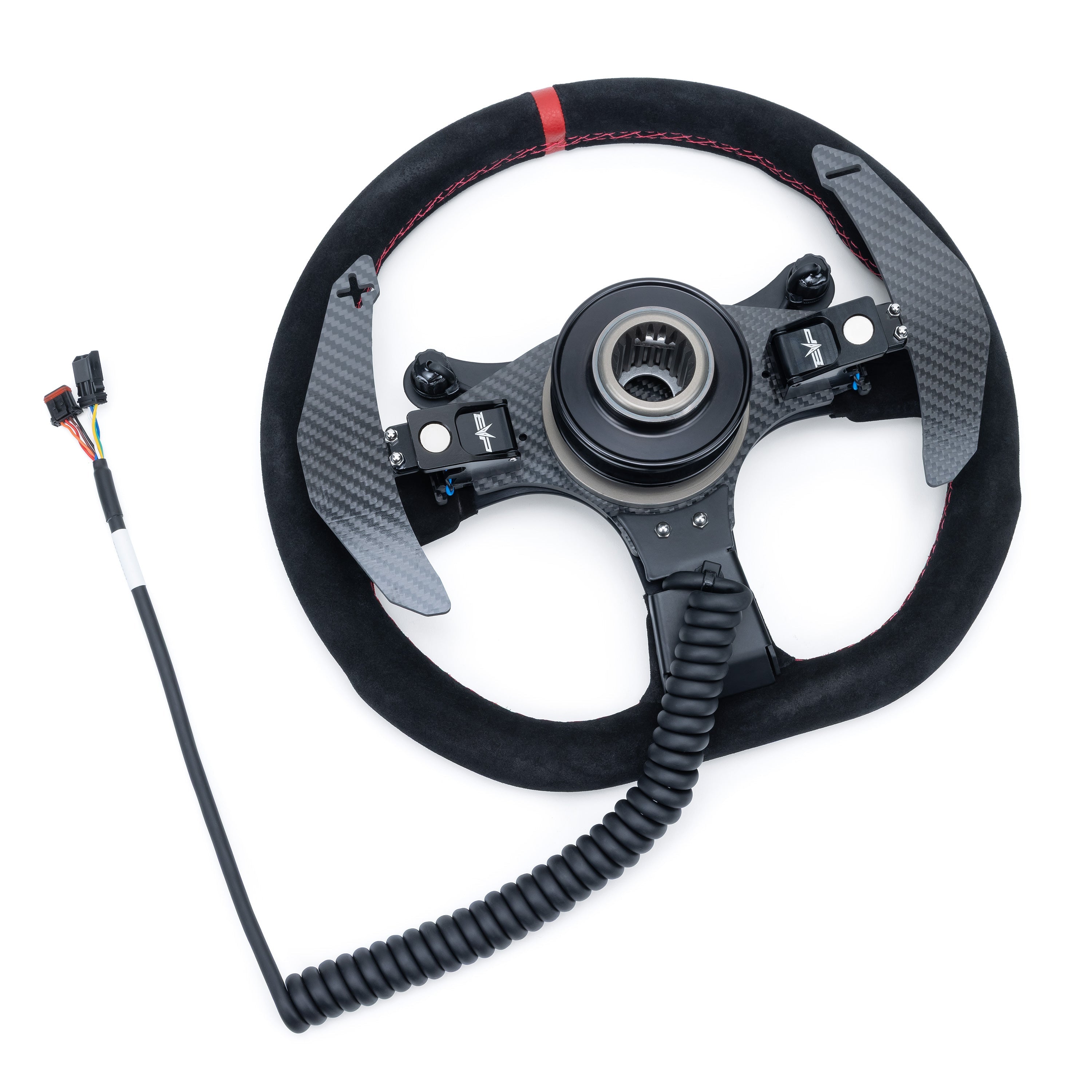 The factory paddle shifters are in a fixed position and don't rotate with the wheel. Kits include integrated carbon fiber paddle shifters that rotate seamlessly with every turn to always keep shifting on point and at your fingertips. EVP's CNC-machined carbon fiber paddle mounts also feature short-throw magnetic actuation, which adds to the tactile feel and helps with quicker shifting.