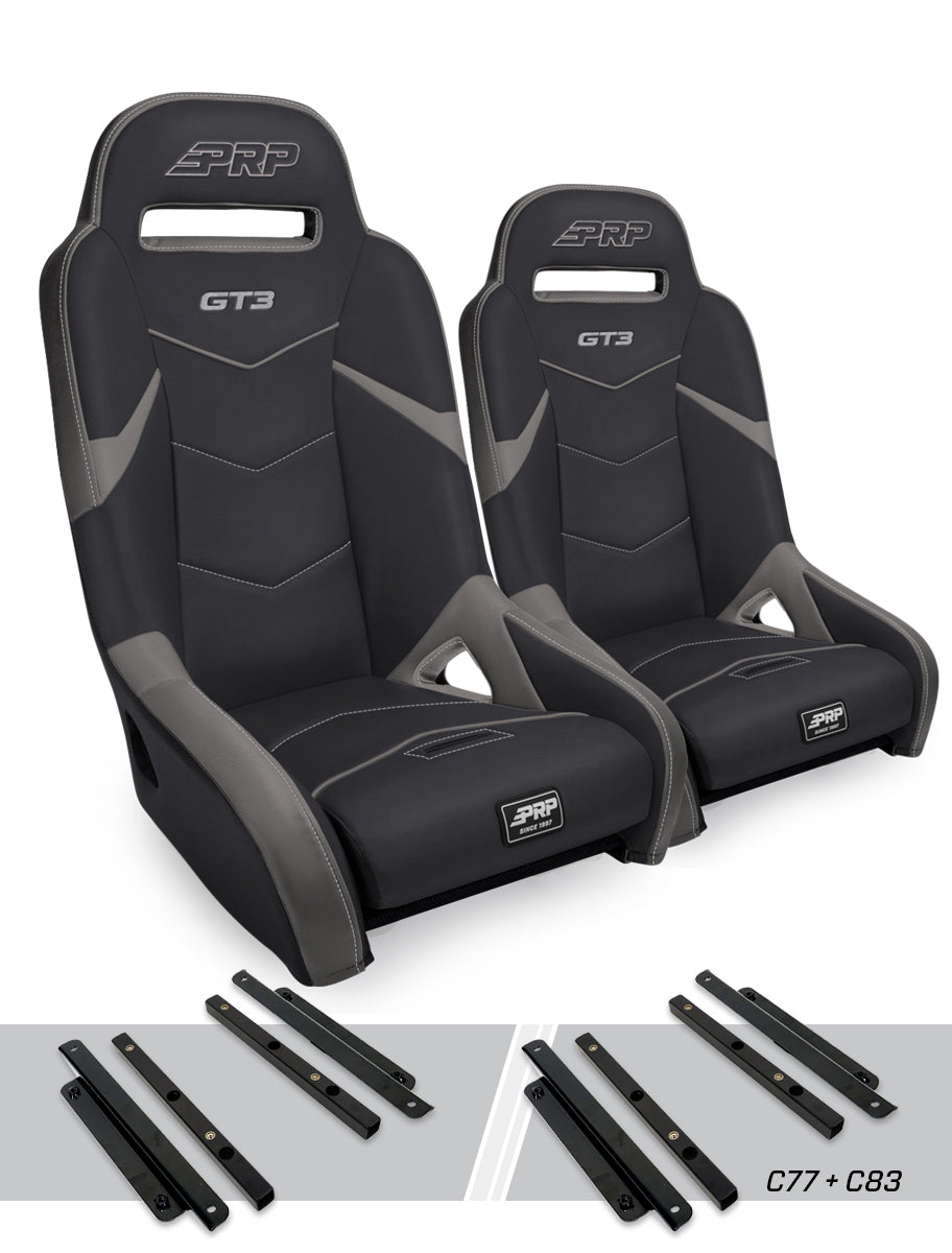 The GT3 is the third generation of our best selling GT Series. New features include a removable seat cushion, a 5th point harness slot, and all new modern styling. Additional bands allow you to customize the colors and materials of your seat more than ever! The GT3 keeps you contained and comfortable with 7? of containment, and a perfect 12° seating angle. Medium level containment on the sides keeps you secure when the ride gets rough, but still makes it easy to get in & out of the vehicle. The vinyl-coated nylon suspension liner and dual-density foam decrease the impact on the body, reducing the fatigue you feel after a long day in the dirt or dunes. PRPs 3 layer gel infused bottom cushion keeps you comfortable on long rides, and is removeable. So you can take it out when cleaning, and allows water, mud, sand, and dirt to drain out the bottom, rather than pile up in the seat. Design your own and Make it Yours! With over 60+ different colors and materials to choose from, you can customize the perfect seat for your ride. Extra options available include Front Goggle Pockets, Rear Storage Pockets, Water Paks, Heated Seats, Air Lumbar, and various Diamond Stitches. Don't forget to complete your UTV interior! Get a set of matching GT3 Rear Seats, Folding Rear Seats, or Rear Bench. Then add more storage to your UTV with PRP's UTV Storage Bags. Proudly Made in the USA. FITMENT: Front Seats - Fits into the Polaris General, General 4 (Front or Rear), XPEDITION, RZR S 900, RZR S4 900, 900 Trail, Trail, XP 1000, XP4 1000, XP Turbo, XP4 Turbo, Turbo S, Turbo S4, RS1. Polaris RZR PRO XP, Polaris RZR PRO XP4, Polaris RZR PRO R, Polaris RZR PRO R4, Polaris RZR PRO S, Polaris RZR PRO S4, Polaris RZR Turbo R, Polaris RZR Turbo R4, Polaris PRO S, Polaris PRO S4, Can-Am Maverick X3, Can-Am Maverick X3 MAX (Front or Rear), Can-Am Maverick R, Can-Am Maverick R MAX (Front or Rear), Honda Talon, Honda Talon 4, Kawasaki Teryx KRX, Kawasaki Teryx KRX4, Segway Villian, Yamaha YXZ - w