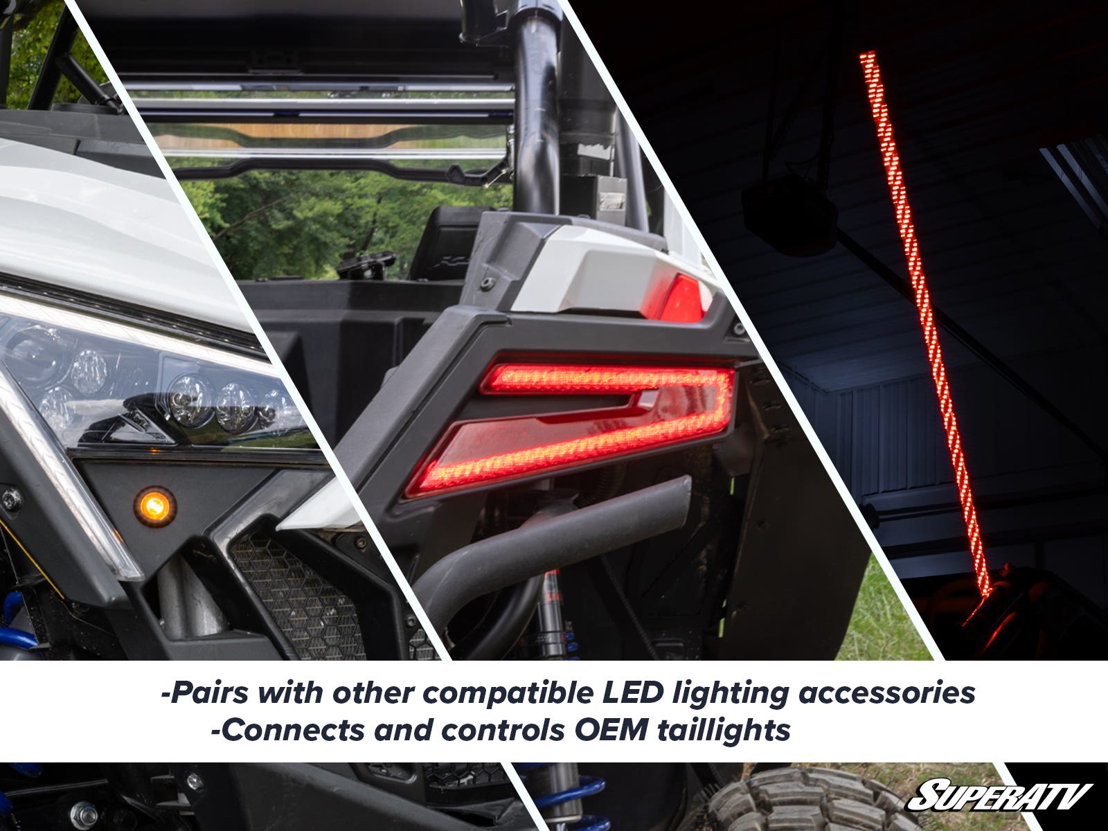 SuperATV’s Polaris RZR Accent Lights are a perfect add-on to our turn signal kit. You get the full rainbow of RGB colors—and it pairs with your sound system! Our BlinkTek syncs it up with our self-cancelling RZR turn signals too.