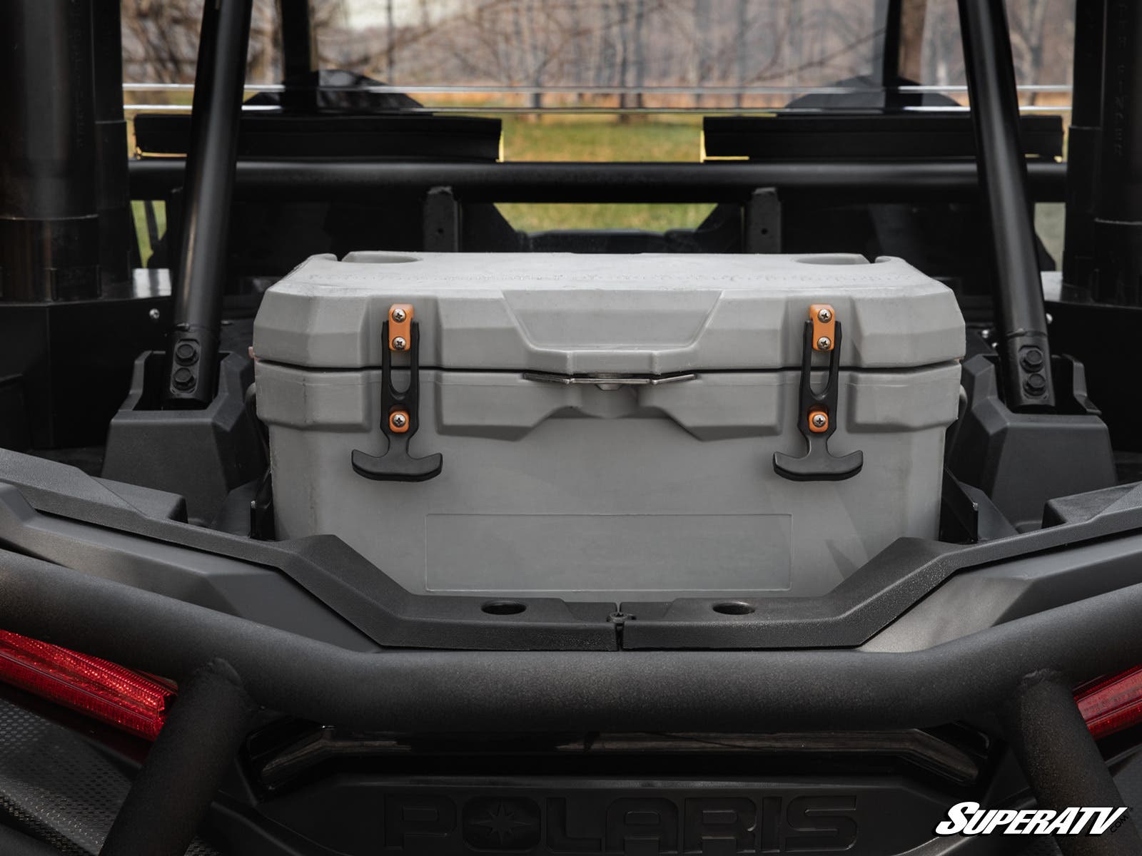The best thing about this cooler mount is that it doesn’t permanently attach the Thermocooler to your RZR’s bed. The bracket lip hooks over the top of your cooler, making it easy to grab it and go when you stop for a break. It also makes filling, draining, and cleaning the cooler a breeze.