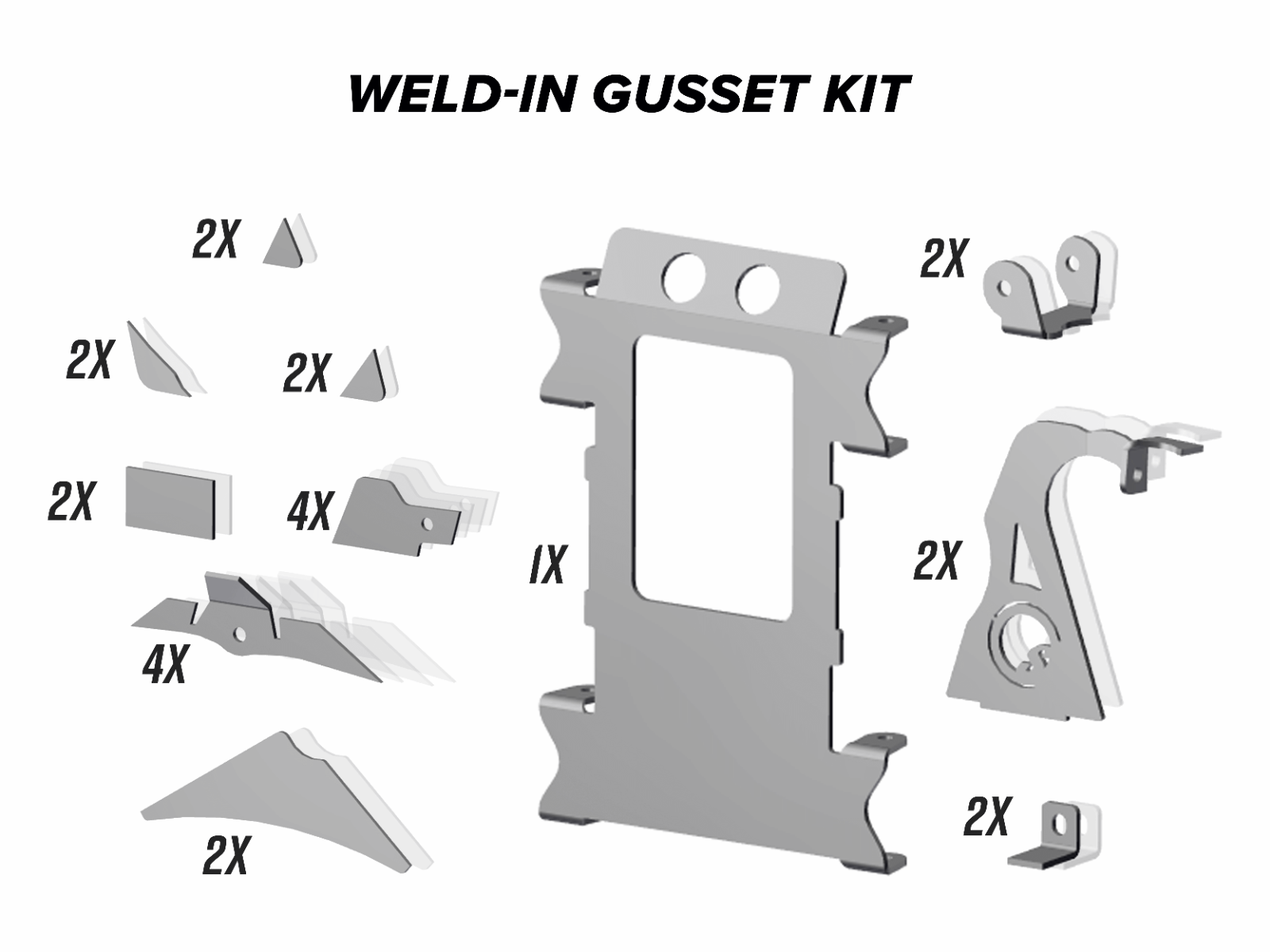 These gussets are made with heavy-duty, laser-cut 3/16” steel. Every piece was designed specifically for a certain spot of your frame to maximize strength while minimizing work. They reinforce your A-arm mounts, shock mounts, and critical shear points. You can ride with confidence knowing your frame has this RZR 1000 gusset kit beefing up its backbone.